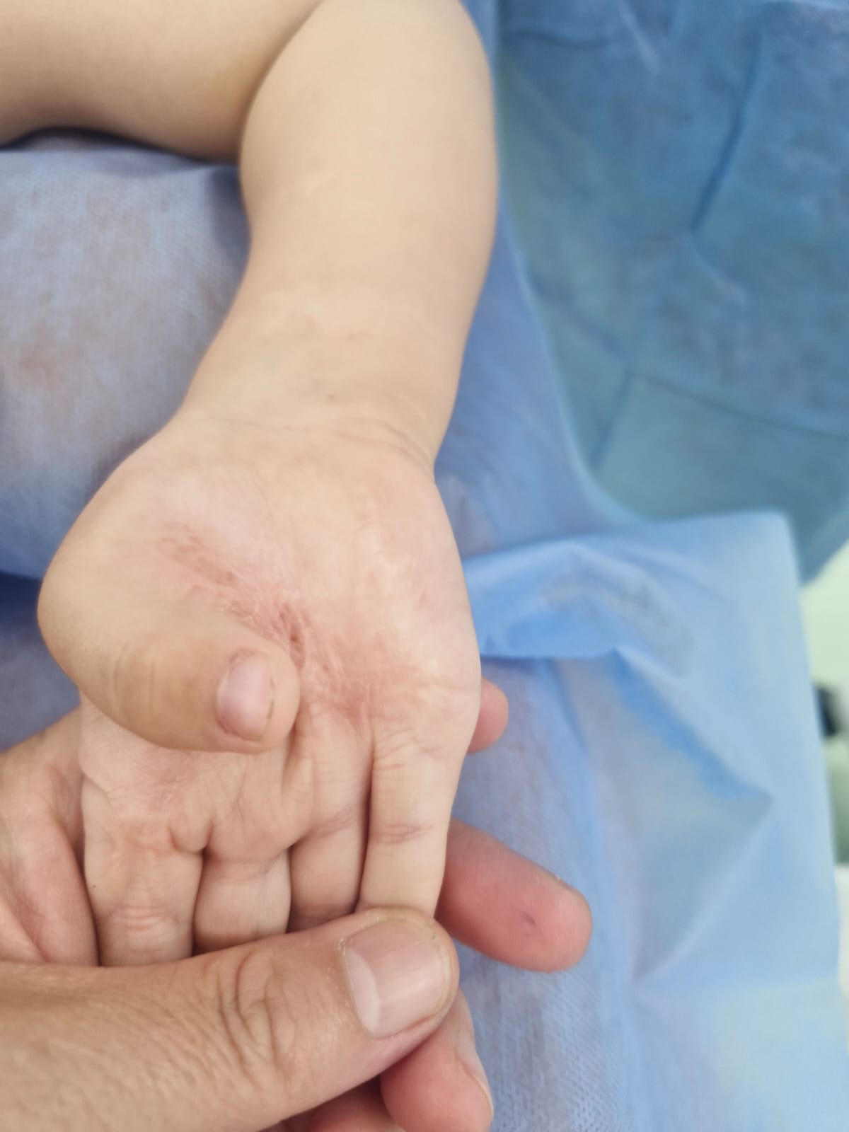 Маленький пациент получил серьёзный ожог, случайно дотронувшись до раскалённого утюга. По словам матери, происшествие произошло дома — ребёнок схватился за горячий утюг и получил ожог кисти, в том числе первого пальца правой руки.